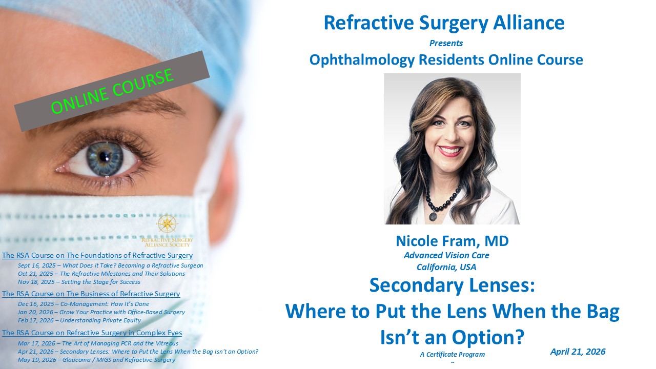 The Refractive Surgery Alliance is pleased to invite ophthalmology residents to participate in the NEWLY formatted RSA Residents Ophthalmology ONLINE COURSE: A Certificate Program. All Ophthalmology Residents/Fellows, and in particular, Residents in 3rd and 4th year, are encouraged to attend and take advantage of this one-of-a-kind Online Course designed specifically for Ophthalmology Residents. A total of 3 COURSES (nine webinars) make up the 2025 – 2026 Certificate Program. The content is timely, relevant, and can be put into practice immediately. Presenters include true “masters of refractive surgery”. This program is designed to supplement residency education with state-of-the-art concepts about the fastest-growing specialty in ophthalmology – Refractive Surgery!