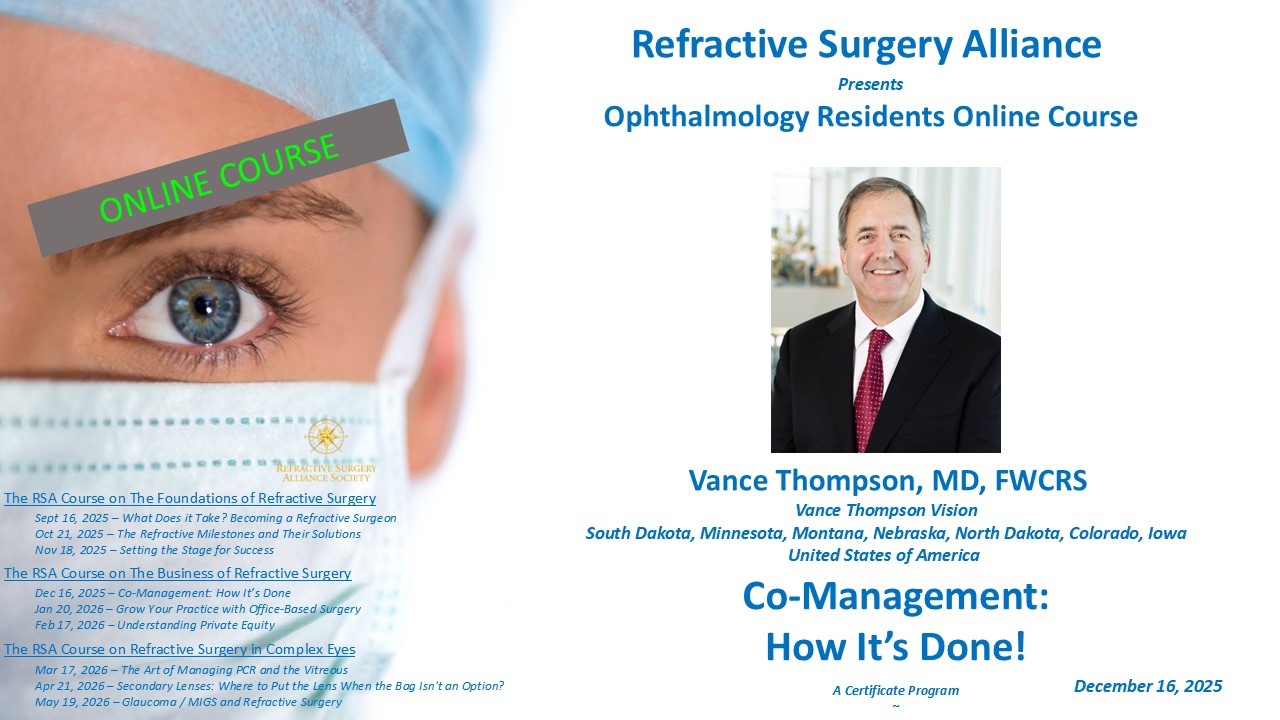 The Refractive Surgery Alliance is a professional organization and does not provide medical services or advice. Information provided here is obtained from a variety of sources and is provided for informational services, only.