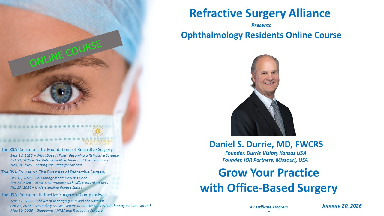 The Refractive Surgery Alliance is a professional organization and does not provide medical services or advice. Information provided here is obtained from a variety of sources and is provided for informational services, only.
